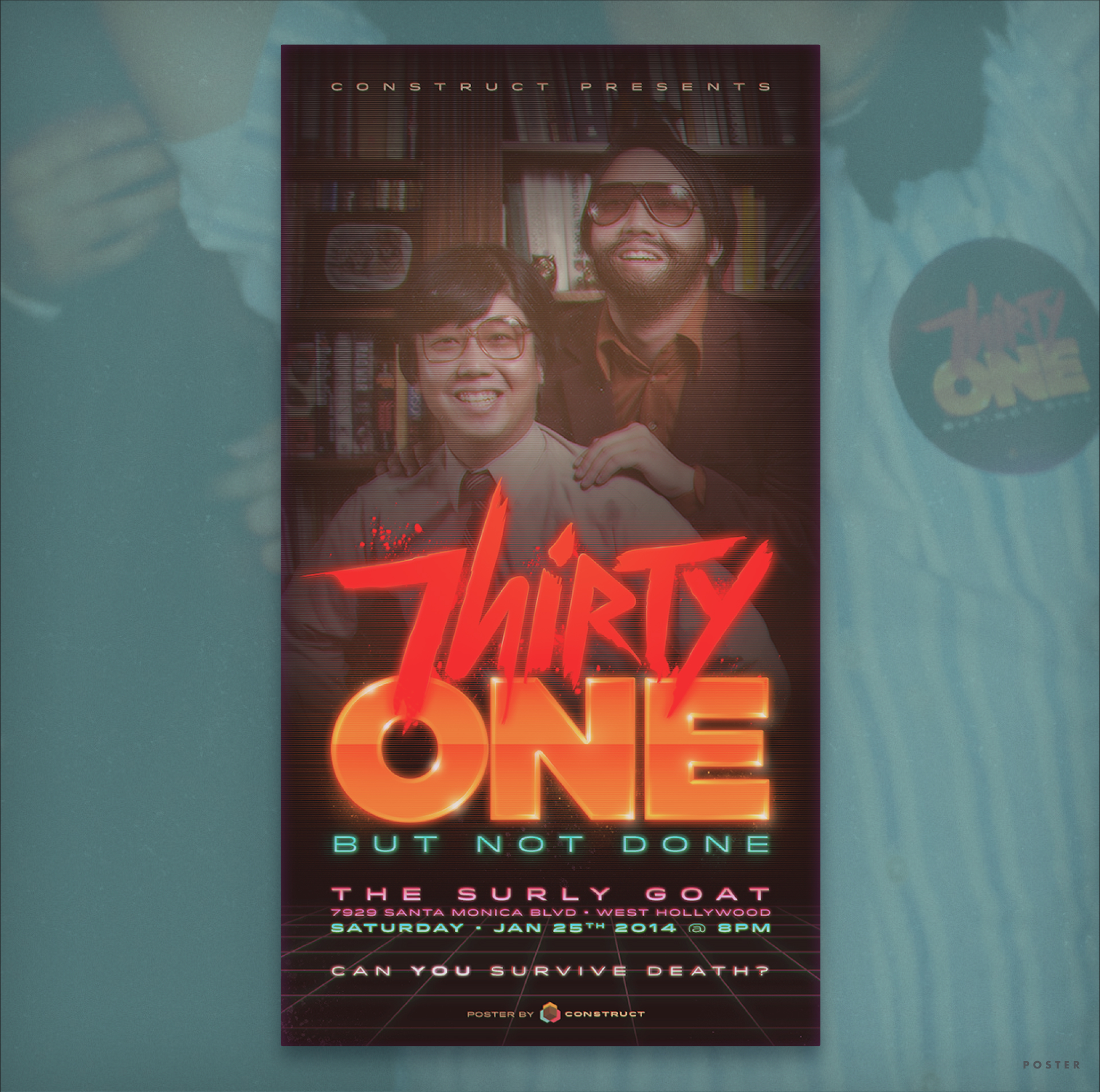 The poster features a custom typeface and treatment in “Thiry One” as well as a composite photo of what appears to be me and a bearded twin (they’re both me and I drew on the beard). The rest of the colors found and infinity grid patterns are all references to vaporwave and 80’s aesthetics—even the cheesy 80’s action movie-like tagline: “Can you survive death?” For which I was absolutely entertained by, as ridiculous as it sounded.